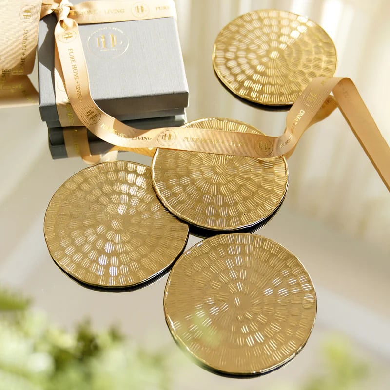 Enhance your table with these gold metal coasters from Pure Home + Living, showcasing a distinct line hammered finish. Their round design offers a modern aesthetic, complemented by the artisanal texture.