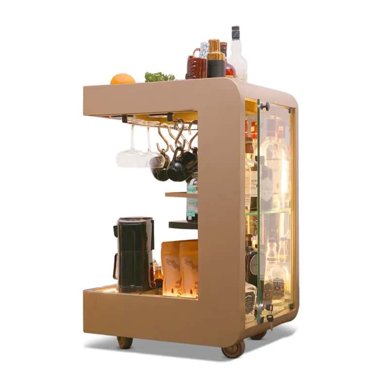 Haus of Bars’ Model C doubles up as a full-blown cocktail and spirits station. It is a multi-functional and easy-to-use home bar that is perfect for getting a hot cuppa or a drink in the most compact, functional and aesthetic form. It comes with an inbuilt coffee percolator from Hamilton Beach, an electric kettle and a milk frother for that cappuccino at home! It even comes with a dedicated space to hang your cups along with glassware. Model C also has a bezel-less, backlit mirrored cabinet that looks stunning and is perfect for storing all your bottles in style. The bar has 2 storage sections at the base that can be used to stock some coffee bags or an ice bucket (depending on the use). It has four castor wheels which are hidden beneath the base so the unit can be easily moved around. Inspired by the need to have a bar with a great coffee game, our Model C is the most stunning new addition to the repertoire of our home bars. It is truly an AM to PM bar!