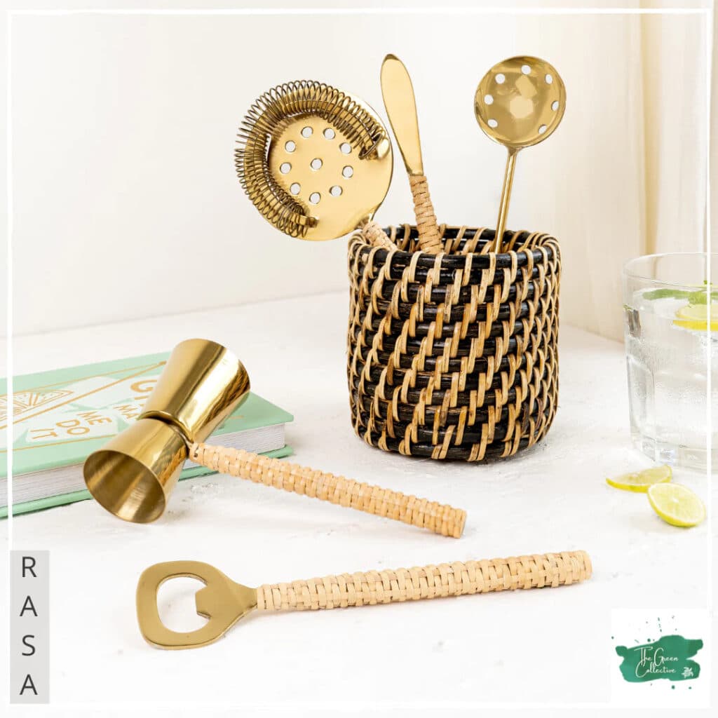 Get set to make your favourite cocktails in a trendier way with the RASA Bar Tool Set. These stainless steel tools with food-safe and FDA-approved gold coating, come with handles that are handwoven and braided in natural cane by master artisans, making this set at once unique and stylish. The set of 5 includes a Stirrer, Bottle Opener, Jigger/ Peg Measurer, Ice Scoop and Hawthorne Strainer. The RASA Set is not just great for your bar or parties but also makes the perfect gift for the festive season.