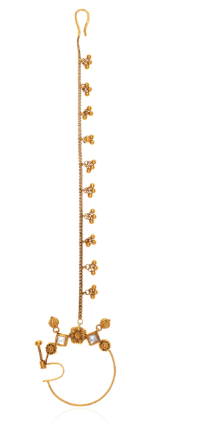 Regal Kundan Gold Nath from Senco Gold & Diamonds– This 22K gold nath is a timeless treasure, ideal for your bridal trousseau. A stunning fusion of tradition and elegance, it features intricate floral motifs, delicate kundan embellishments, and a graceful chain with dainty gold accents. The perfect final touch to your bridal ensemble