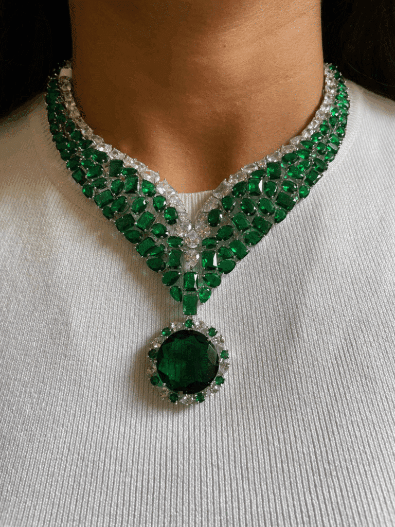 Ramona Emerald Diamond Necklace Set from PRERTO– The Ramona Emerald Diamond Necklace Set (Necklace & Earrings) is an absolute Statement maker to take your outfit a 10 on 10 look. This Necklace is handcrafted to make to shine every time you adorn it. Perfect for Any Occasion.