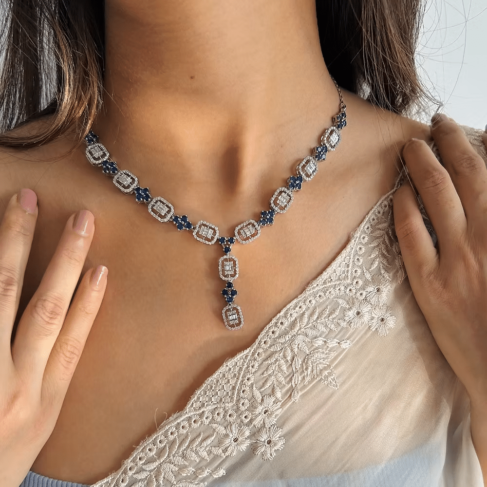 Taarini is designed to add a touch of timeless sparkle to your festive celebrations. Perfect for both a lively Diwali party or a serene family puja, this exquisite set beautifully blends heritage-inspired design with a modern twist. Handcrafted in 925 sterling silver, it features dazzling cz diamonds paired with striking blue sapphires, making it a versatile choice for any occasion. Complete with a necklace and matching earrings, Taarini is the perfect embodiment of elegance and tradition with a contemporary edge.