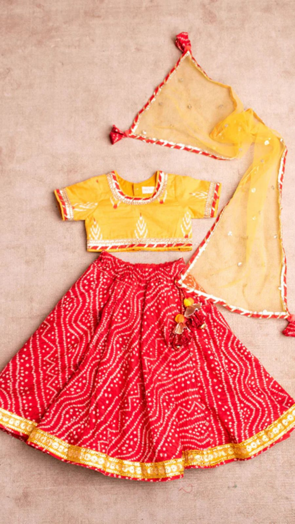 Outfit Idea: Embrace the energy of red with Fayon Kids Red Bandhej Lehenga Set, a perfect blend of tradition and elegance. Style it with statement gold jewellery, soft waves in your hair, and minimal makeup to let the outfit take centre stage. Complete the look with juttis and a classic red bindi for a powerful festive vibe.