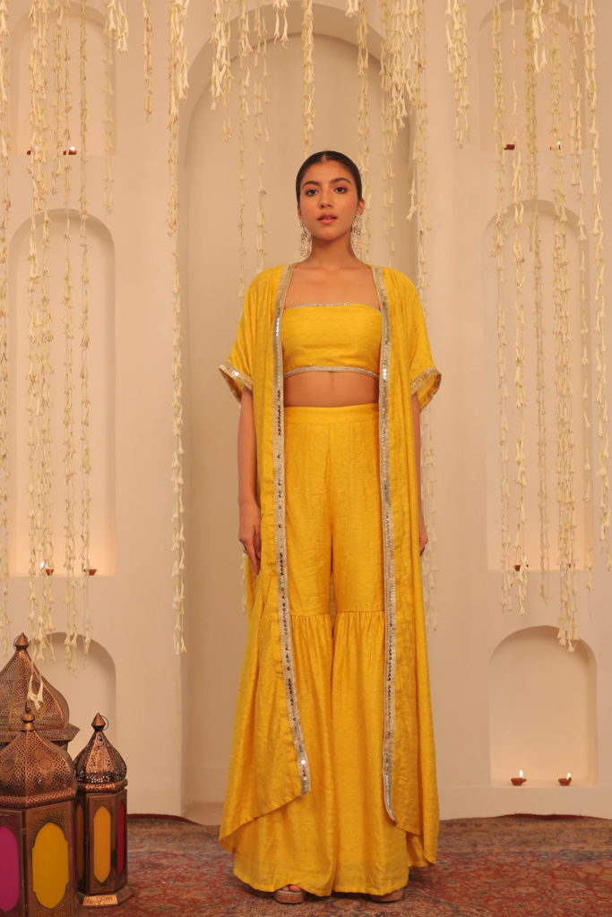 Alaya Mehfil Yellow Overlay Set- This Overlay set in Yellow from our collection Mehfil is a perfect outfit for any special Occasion. It is made from the highest quality Cotton. The Overlay Set comes with a Square neck tube top, Pants, and an Overlay. The Overlay has beautiful Embroidery. It has Full Sleeves adding elegance to the outfit. The Tube top and the Pants have a Side Zip Closure with elasticated backs. The Overlay Set can be worn on Special Occasions like Festive Gatherings, Weddings, or Casual Outings.