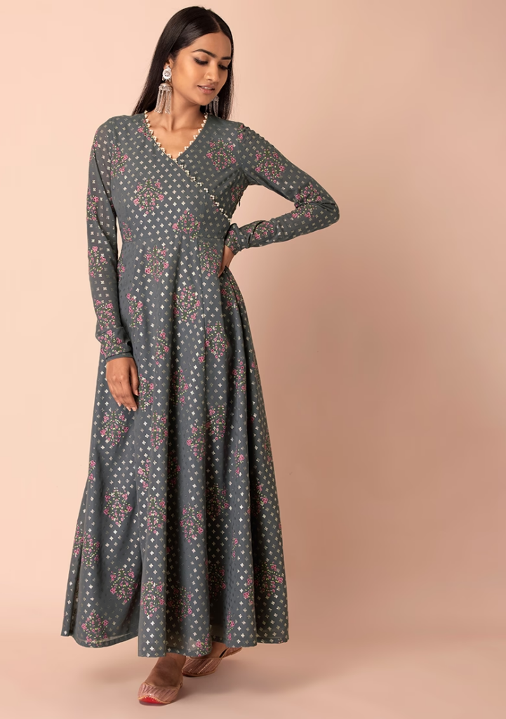 This Grey angrakha kurta in georgette from Indya is a stunning set that is perfect for your festive pooja. Tailored with full churidar sleeves and a V-neck, the kurta features all-over foil print, pearl embellishments and a shantoon lining. Finished with a concealed zip closure.