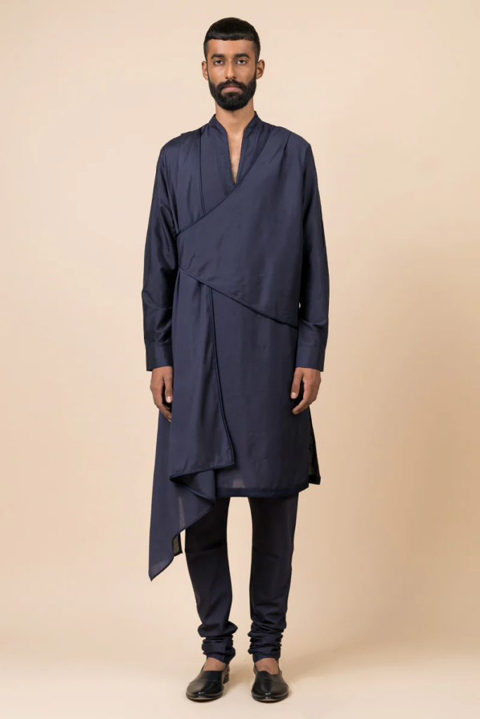 This navy kurta set for men offers a contemporary twist on the classic kurta. The kurta features an asymmetrically draped front panel, giving the ensemble an avant-garde touch. The set is completed with matching tapered Aligarhi bottoms, creating a cohesive and stylish look. Perfect for those who appreciate modern design with traditional roots, this kurta set makes a distinctive statement at any occasion.