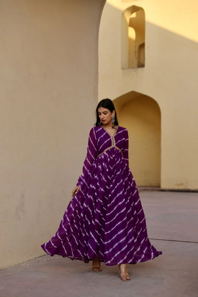 This Purple tie and dye lehariya anarkali set is a special edition from our selection. It features hand tie and dye Georgette fabric, with a 100% cotton pant. The anarkali comes in a vibrant purple color and both sides feature pockets for added convenience. Be sure to get your hands on this one-of-a-kind set today!