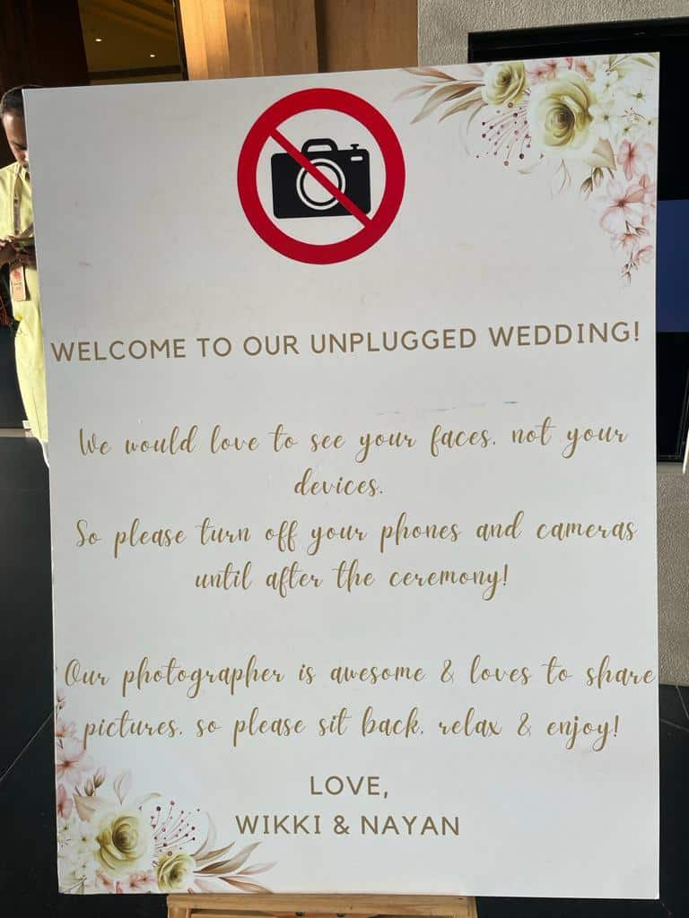Inside pictures are being circulated on social media. Pictures of the welcome banner, a sign that says it’s an ‘unplugged wedding’, and customised water bottles were posted on various platforms.