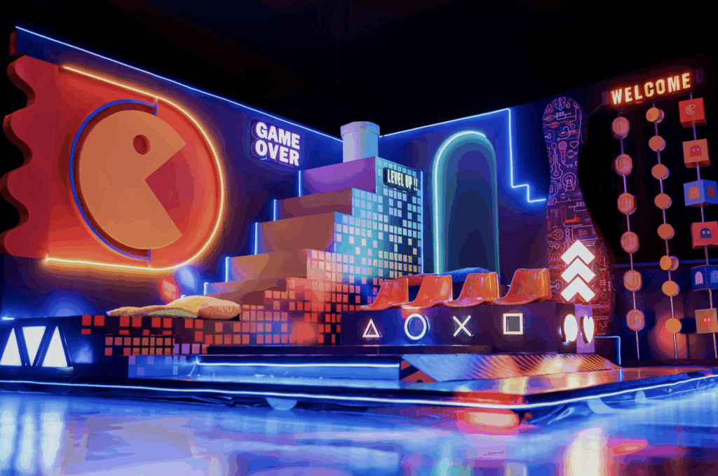 Our favorite is an afterparty that carried the story of the couple’s first meeting at Dave & Buster’s, playing Pac-Man. Guests stepped into a replica arcade before passing through a portal into a life-sized Pac-Man maze, where programmed tech turned the arena into a living video game. Nostalgia became an immersive world where love and play collided.