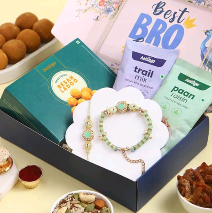 A wholesome blend of tradition and treats, this hamper features a beautiful Bhai-Bhabhi Rakhi pair, Besan Ladoo, Trail Mix, and Paan Raisins. It’s perfect for expressing love and care to your favorite sibling duo.