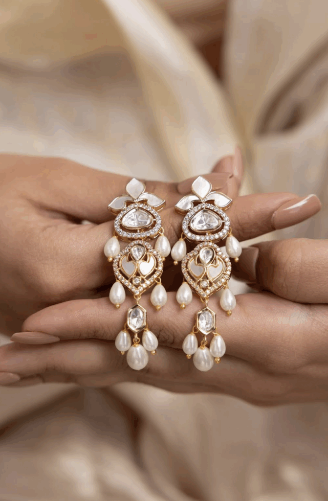 The Elaris Earrings by Joules by Radhika make a stunning Rakhi gift—classic, elegant, and full of timeless charm. Adorned with polki stones and tiered pearl hangings, they’re perfect for weddings, festive gatherings, or days when your sister wants to add a heritage touch to her look. It’s a thoughtful way to say: you deserve pieces as graceful and enduring as you are.