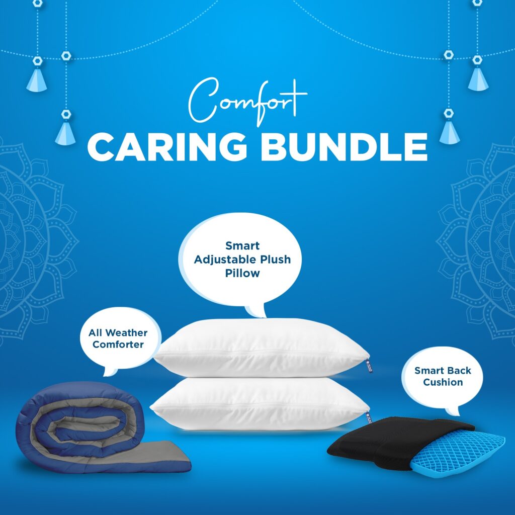 A Gift to Remember, For Every Sister!Don’t miss a single moment to show your sister how much you care for her! And hence, here is our specially curated Comfort Caring Bundle for every sister out there! This Rakhi, delight her with our Cozy Comfort Caring Bundle. The Comfort Caring Bundle Includes 2 Smart Adjustable Plush Pillows, Blue & Grey Comforter (Double) and Smart Back Cushion