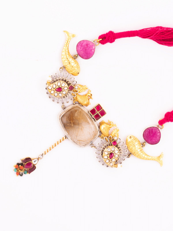 Dive into the elegance of our Exquisite Fish Fusion Choker Necklace, perfect for special occasions. This stunning piece features a harmonious blend of colourful gemstones, with radiant fish and bird motifs that symbolise freedom and beauty. Experience the craftsmanship and allure of this ornate accessory!