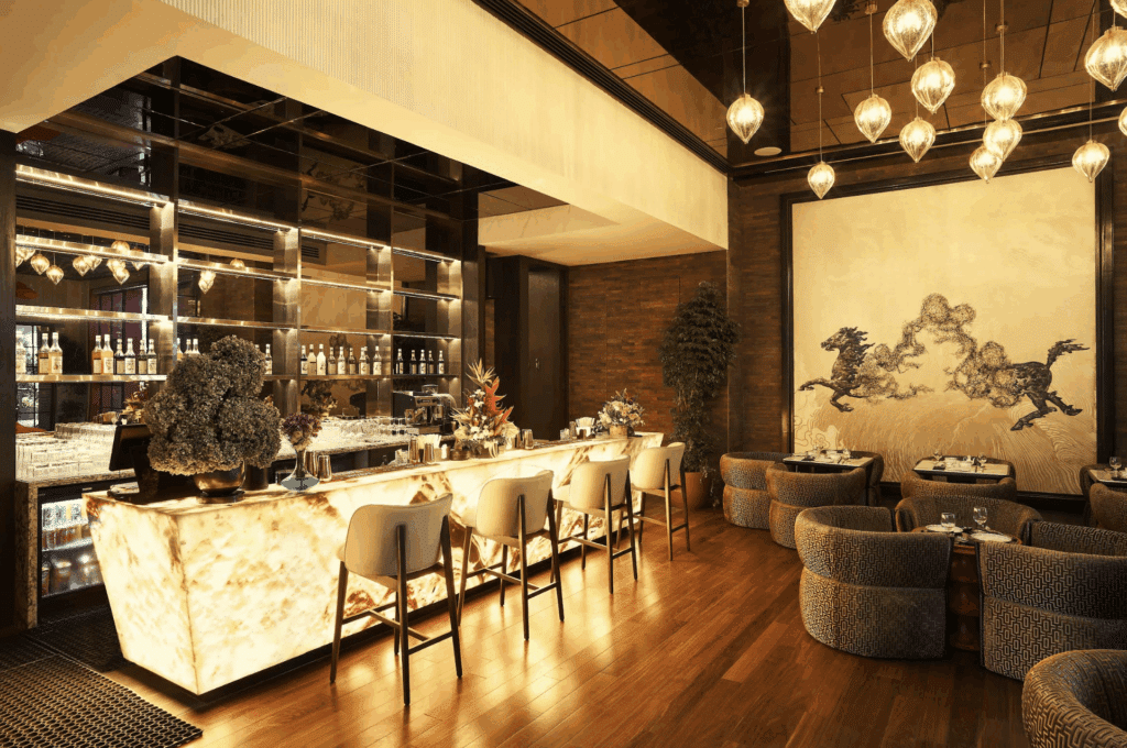 The interiors, imagined by Ganesh Madasamy of Aston Design, draw inspiration from the myth of the phoenix—a symbol of rebirth and ascension—woven seamlessly with Bengaluru’s identity as the Garden City. Bamboo-inspired chandeliers, soaring private dining walls, flowing ceiling details, and a palette of gold, amber, and deep blue create an atmosphere of understated opulence. Seating 160 guests across intimate booths, elegant private rooms, a main dining hall, and a semi-al fresco section, the restaurant caters to intimate evenings, celebratory gatherings, and everything in between.