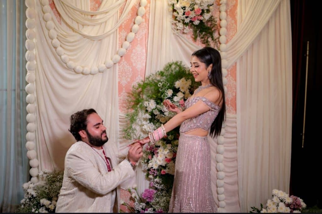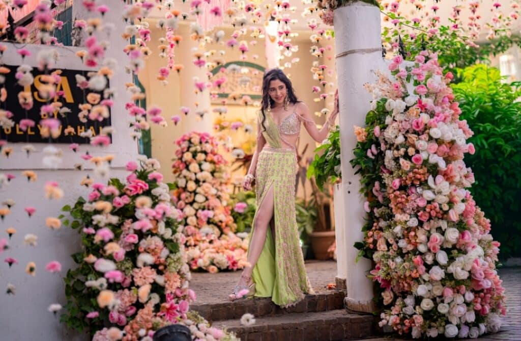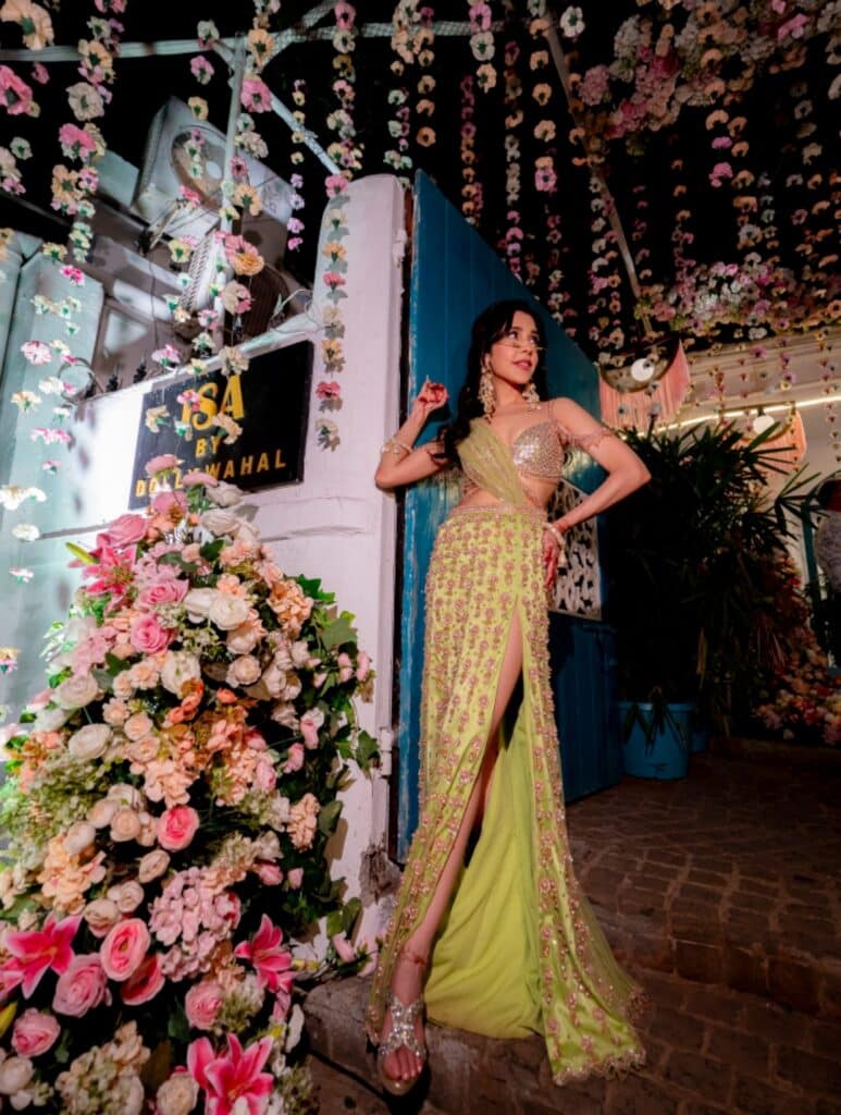 The vibe was relaxed—a floral sundowner with soft colours and an easy warmth. Siya wore a lime green saree from Isa, with a contemporary slit and delicate embroidery. It felt fresh, slightly unexpected, and completely in line with her personal style—nothing overdone, just confident and expressive.