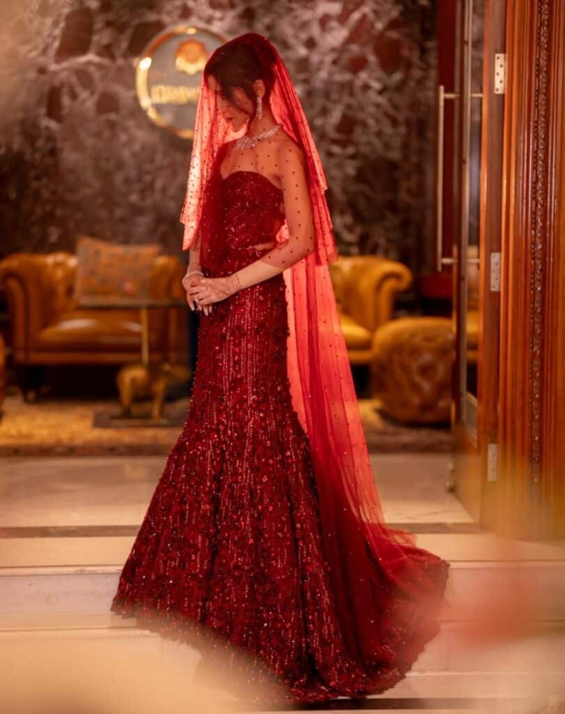 The final reception in Delhi brought everything together in the most dramatic way. Siya wore a burgundy mermaid lehenga with a long trail and a sheer veil that added just the right amount of drama.