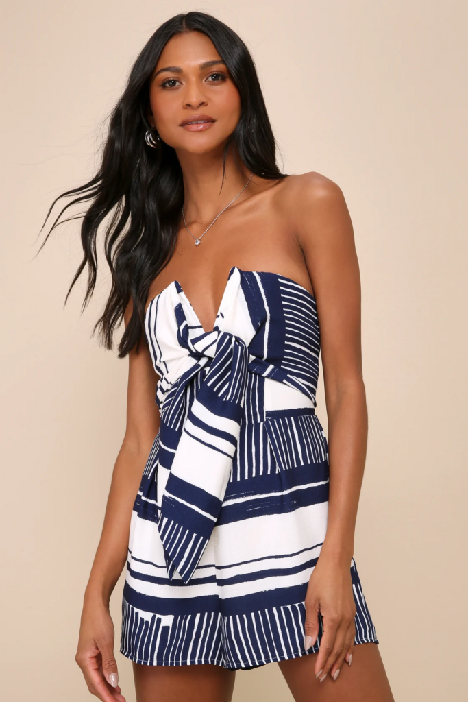 The Delphi Blue and White Striped Tie-Front Strapless Romper from Lulus offers a fresh, nautical-inspired look, perfect for warm-weather getaways. With its flattering strapless design, tie-front detail, and playful striped pattern, it’s the ideal choice for effortless beachside style and day-to-night versatility.