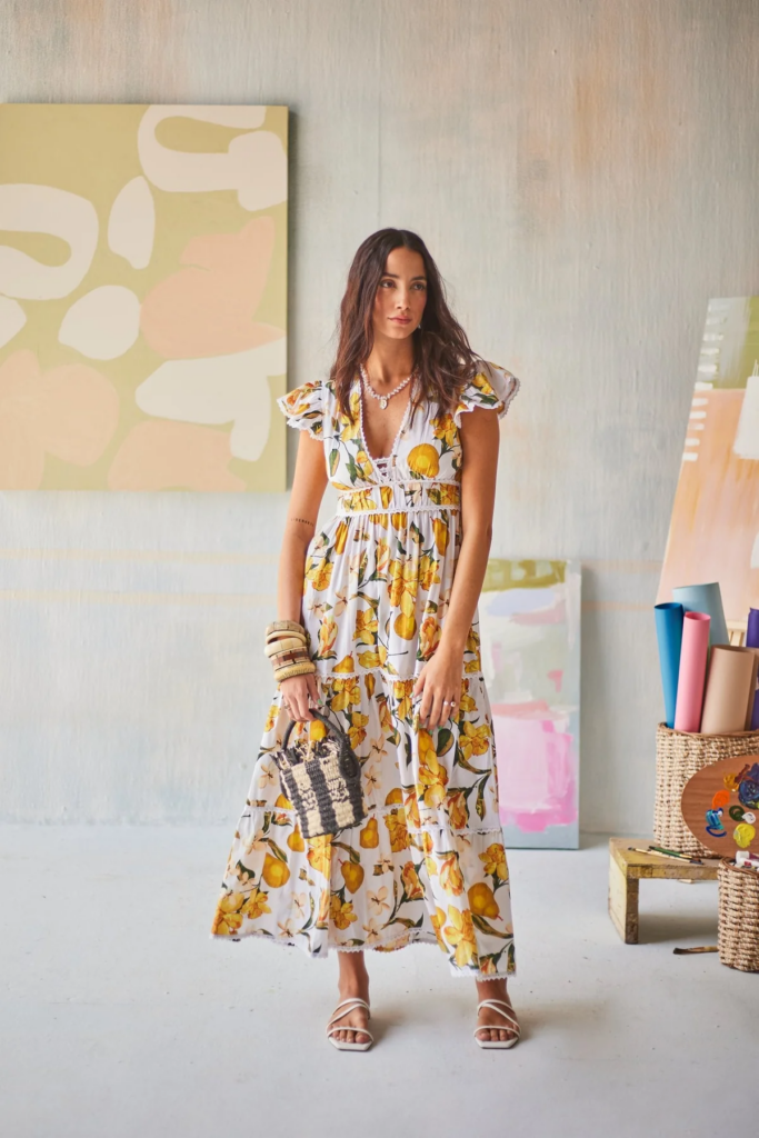 Introducing the Noemi Dress from SAGE by Mala, a perfect blend of feminine charm and bohemian elegance. Made from poplin cotton, it offers comfort with style, featuring an enchanting yellow, green, and white print inspired by a blooming pear orchard. Delicate lace detailing along the neckline and sleeves adds romance, while the V-neckline and flowing skirt create an ethereal silhouette. Ideal for both casual outings and special occasions, it effortlessly transitions from day to night with sandals or heels and statement jewelry.
