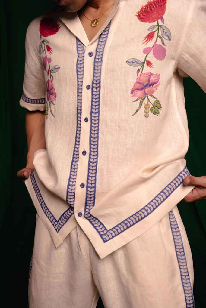 The Foliage Linen Men’s Camp Collar Shirt from Saphed offers a relaxed, yet refined look, perfect for warm-weather getaways. Crafted from breathable linen, its subtle foliage print adds a touch of nature-inspired elegance, while the camp collar ensures a laid-back, vacation-ready vibe.