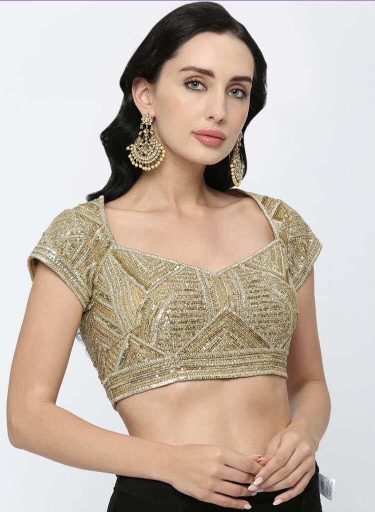 A gold statement blouse comes in handy especially if you are a bride who is looking to borrow their mom’s saree for pre-wedding or post-wedding festivities. This gorgeous blouse with Sequins and Gota Embroidery from Neha Mehra is must have!