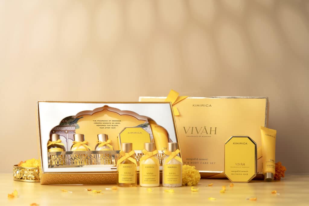 Step into a world of vibrant traditions and cherished memories with the Vivah Experience Set from Kimirca. Inspired by the scents of an unforgettable Indian wedding, this collection brings you the enchanting fragrances of Marigolds and Lotus. Infused with skin-loving ingredients like Turmeric, Shea Butter, and Aloe leaf extract, these self-care essentials leave your skin feeling nourished and pampered. More than a gift, it’s a box full of love, tradition, and pampering to the bride!
