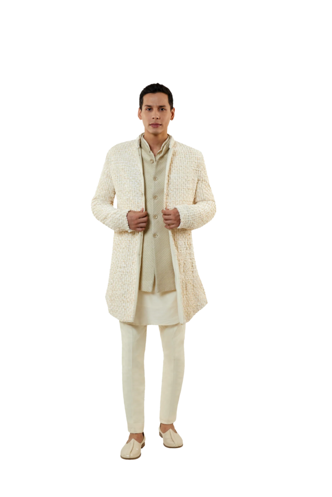 Introducing a subtly lavish jacket that exudes timeless elegance, featuring our signature velvet ‘Flower’ threadwork embroidery in delicate vanilla tones. This refined piece is designed with a slant cut and a sleek show placket, beautifully accentuated by regal Ashoka buttons for a distinguished finish. The soft velvet fabric enhances its luxurious appeal, while the matching vanilla breeches complete the ensemble with sophistication. Perfect for those who seek understated opulence, this jacket is a masterful blend of tradition and contemporary flair, ideal for making a memorable style statement at any occasion.