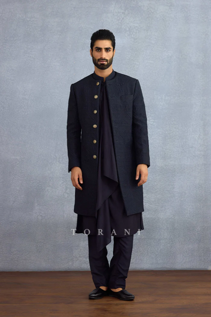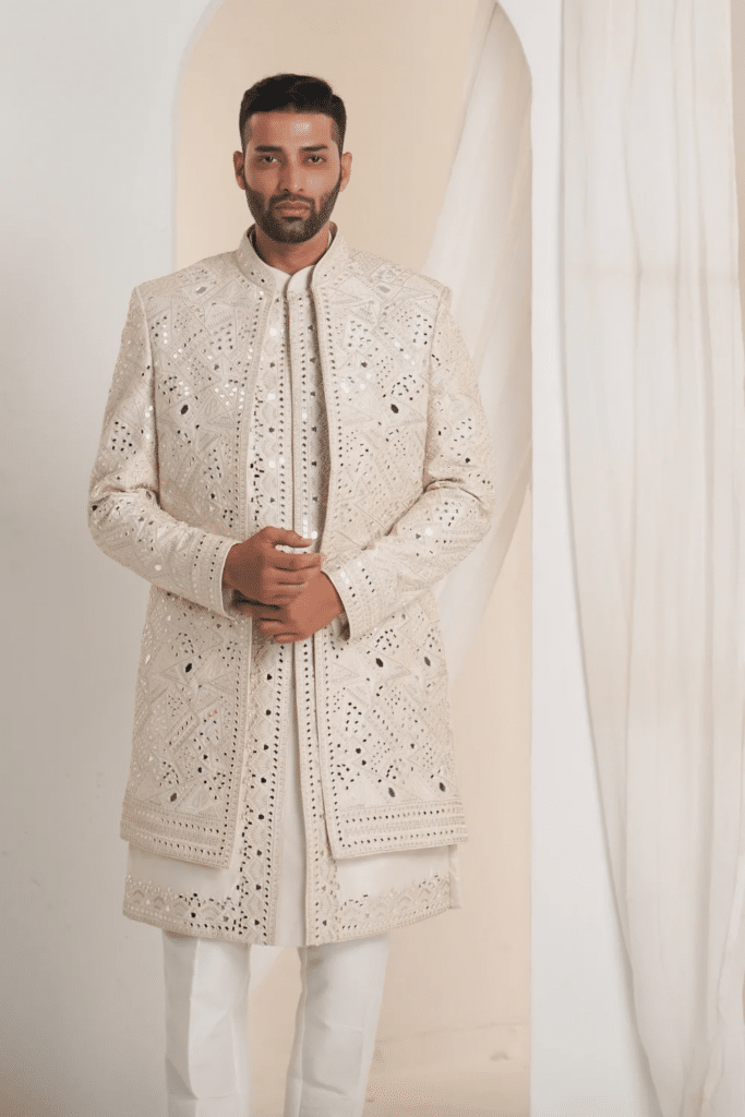 This Diwali, elevate your festive wardrobe with timeless yet bold choices that go beyond the traditional bandhgala. Opt for a cream-white silk open Indo-Western ensemble with striking mirror work, or a sleek black Jodhpuri set for a refined, regal look. For a pop of color, a yellow ombre silk koti set with intricate hand and machine work makes a perfect statement. And if you’re looking for a fusion of classic and contemporary, a black silk sherwani with silver machine work is sure to turn heads