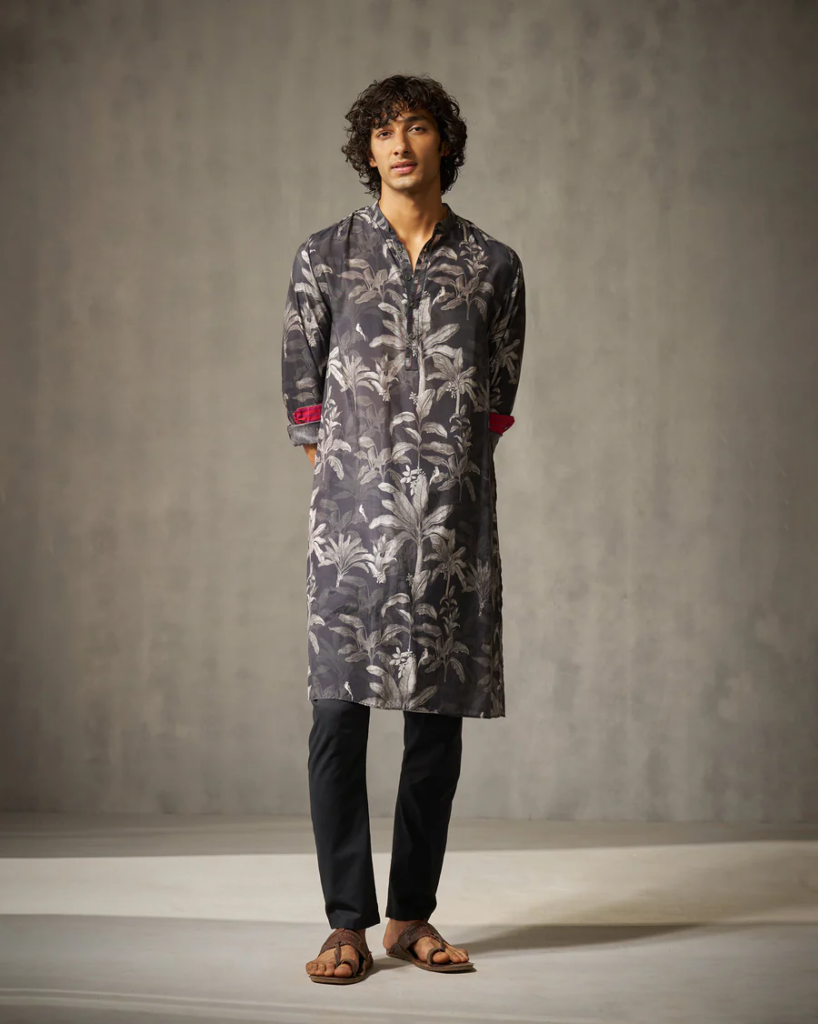 Nothing says festive like a printed Astral Kurta in Black & Grey Print from Nicobar. Our Astral Kurta features a classic fit and monochrome print of lush palms, inspired by our travels to Morocco.
