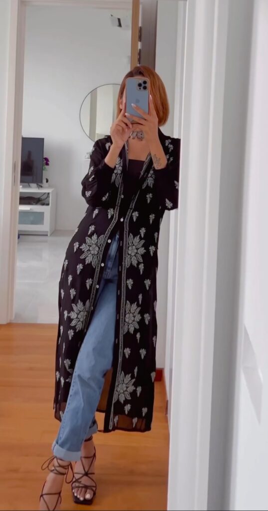 Luckhnowi Chikankari is one of my favourite embroideries. Easily available in different colours, fabrics, and designs, clothes in chikankari embroidery will always make you look stylish. If you do not wish to wear a kurta or saree, then you can try the indo-western look by opting for a georgette chikankari long jacket. Wear it over a tank or tube top and pair it with skin-fit ankle-lenght denims.