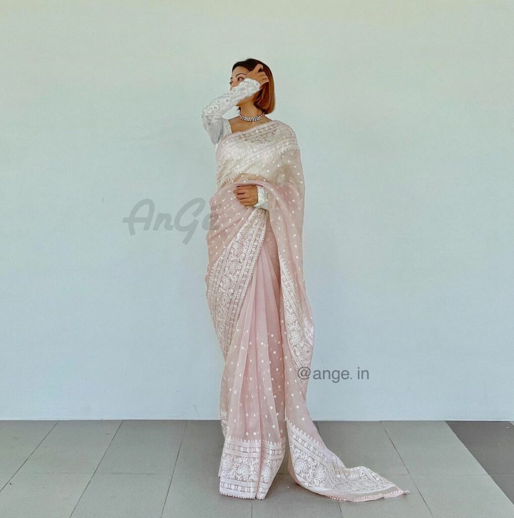 Organza sarees look beautiful, and they can also make you look elegant. You can opt for an organza saree in colours such as white, pink, green, lavender, and yellow. Opt for a contrasting coloured blouse to accentuate the overall look and enhance it further. Accessorize with a statement necklace or earrings, and bangles or cuffs on your hands. Also, make sure that you drape the saree well so that the pleats stay in place and do not get messed up due to the fabric’s slippery texture.
