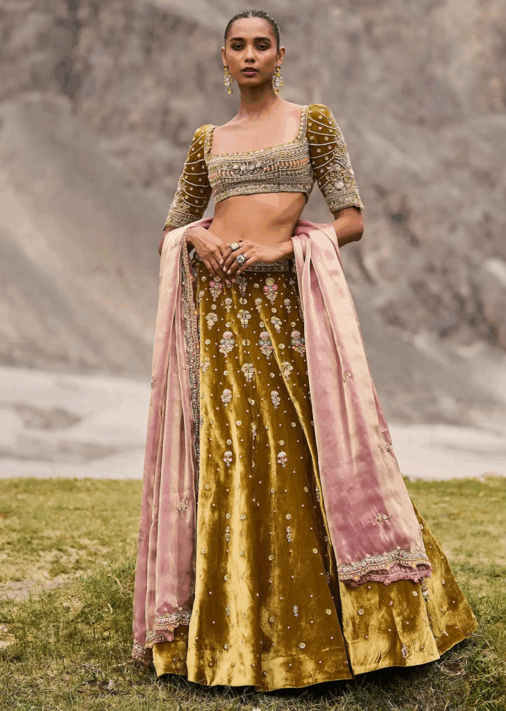 There’s nothing quite like velvet when it comes to creating a mood. Its plush texture catches light differently with every movement—making lehengas, anarkalis, and even tailored sherwanis look richer, deeper, and more mysterious. Designers are leaning into jewel tones—emerald, sapphire, wine, and onyx—draped in fluid silhouettes that are as modern as they are majestic. The new-age velvet bride isn’t weighed down; she’s empowered, commanding the room with every swirl of her lehenga.