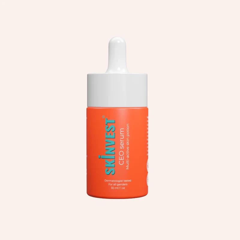 Skinvest – CEO Serum – Skinvest’s CEO Serum is the ultimate multi-functional serum with 25 powerful active ingredients that tackles numerous skin concerns in one single step – making your routine shorter but super effective.This multi-active serum targets dark spots, hyperpigmentation, and fine lines, all while enhancing skin elasticity and delivering deep hydration. Tailored for those who seek noticeable results without the need for layering multiple serums. Whether you’re a busy professional looking to streamline your regimen or a skincare enthusiast craving visible results, CEO Serum fits seamlessly into your routine. Priced at 1200 INR