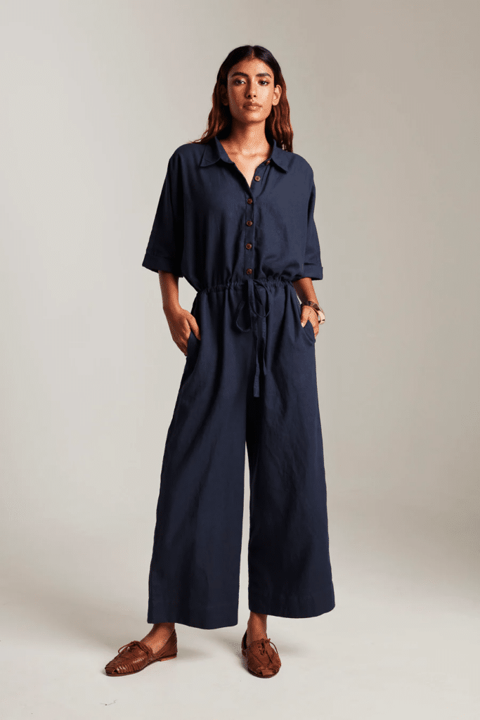 From Saphed Living, this jumpsuit makes an ideal Rakshabandhan gift, blending utility and style effortlessly. Featuring elasticated drawstrings, bold wooden buttons, and functional side pockets, it pairs perfectly with wooden clogs and a tan leather sling for a chic casual evening. Elevate your sibling’s wardrobe with this versatile and stylish piece. Priced at 4999 INR