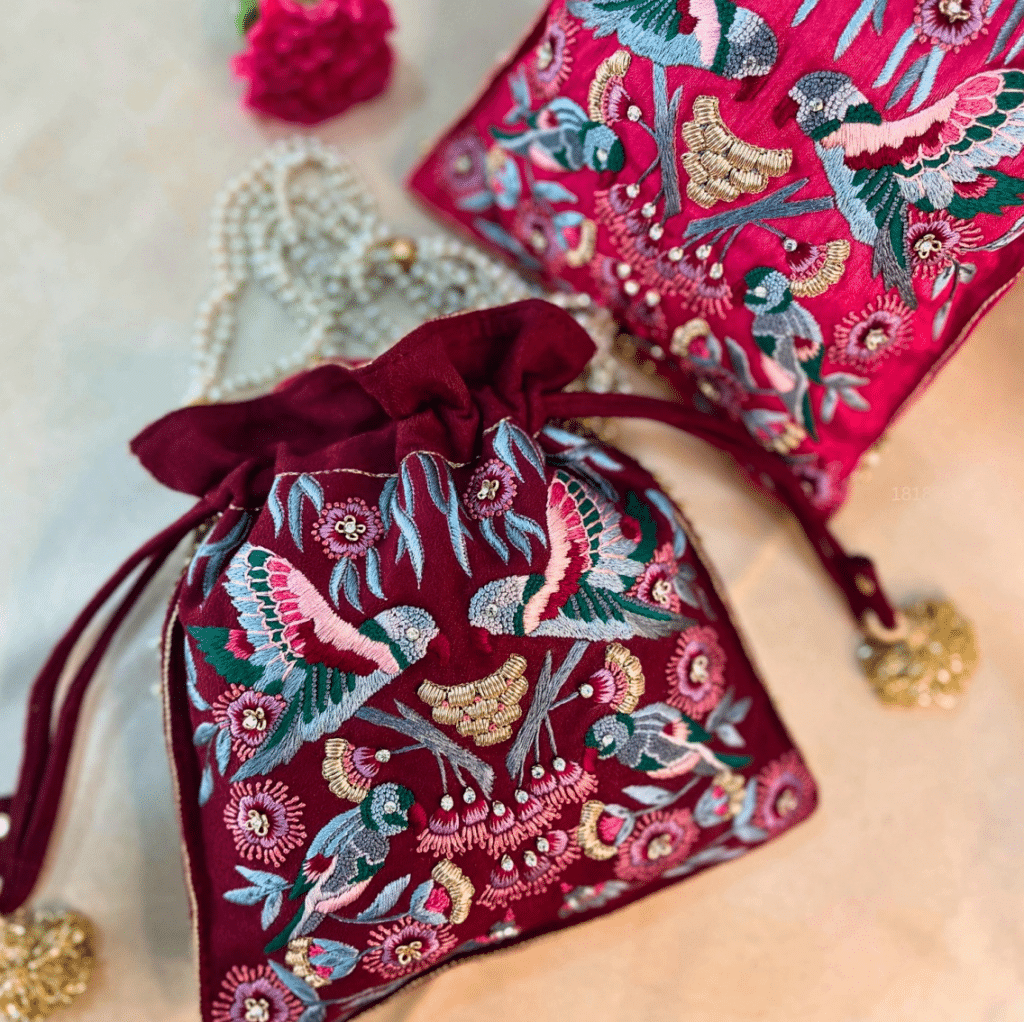 The Diorah Potli Bag from The Shine Official is a timeless, intricately designed accessory, perfect for any occasion. Crafted with high-quality materials, it can be carried elegantly from both sides. This luxurious bag makes a wonderful Rakshabandhan gift, blending traditional charm with modern sophistication.