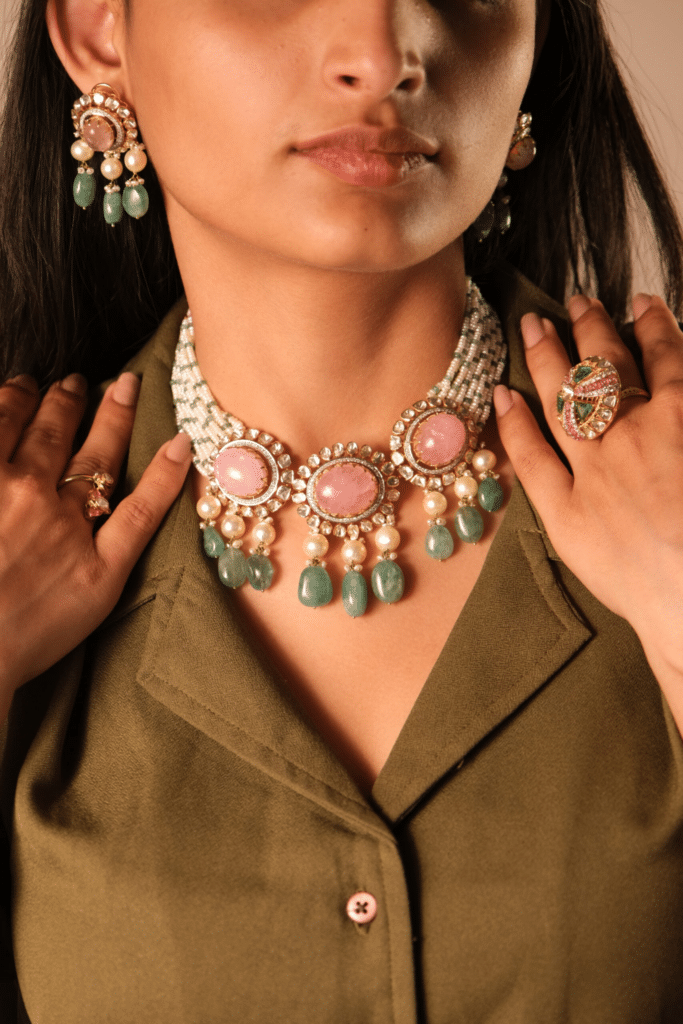 Design-wise, they’re choosing pieces that show craft without the heaviness. Gold with subtle handwork, detailing that sits quietly on the surface, and silhouettes that layer comfortably with multiple looks. The result is jewellery that feels rooted in tradition but edited for today, refined, expressive and built to live beyond the wedding day.
