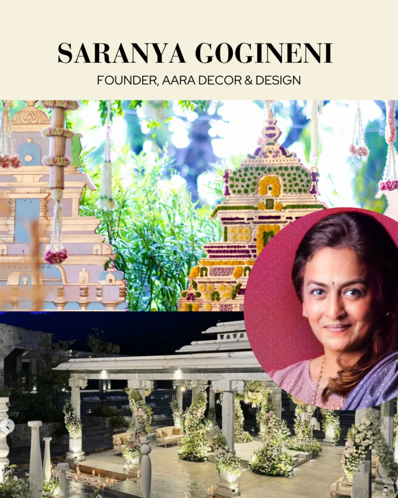 Saranya Gogineni has redefined South Indian wedding aesthetics with her elegant designs and creative themes. Her 2024 weddings blended cultural richness with contemporary artistry, making her a top choice for luxury weddings.