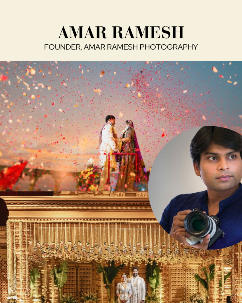 A household name in South India, Amar Ramesh is celebrated for capturing the essence of traditional and modern weddings with unparalleled artistry. His team focuses on storytelling, delivering vibrant and emotive visuals that resonate with every couple.