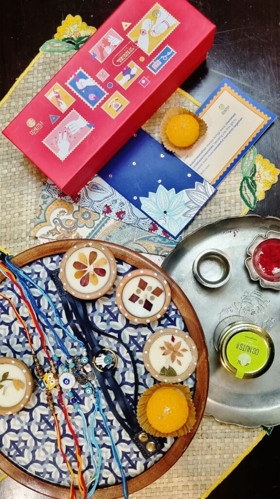 This Rakhi box is designed as a testament to the deep bonds of siblinghood, presented in the form of a nostalgic box of memories. Embracing the timeless charm of simple celebrations from yesteryears, this box design is reminiscent of a bygone era. Through this curation of flavours & Rakhi essentials – Rakhi Set and Kunju-Akshat, we intend to invite recipients to indulge in the art of personal expression and celebrate the essence of warm, sweet & simple love.