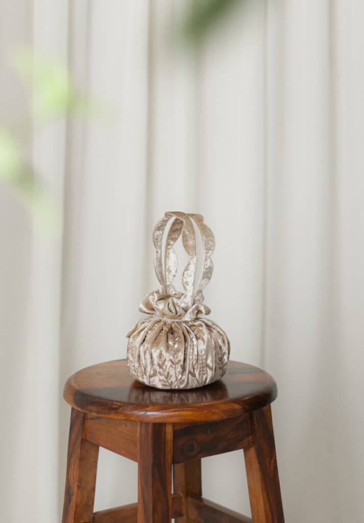 Featuring potli bags from Lavanya Ahuja that flow from day to night, this collection is crafted for cherished moments of togetherness synonymous with the spirit of the season. Focused on weaving the deeply personal into tasteful, performative precision. This bag is a great gifting option adding a touch of luxury!