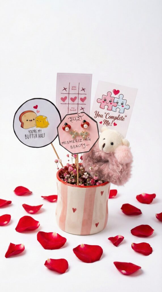 A charming mix of romance and playfulness, the “Be Mine Bouquet” features a heart-themed pot, quirky love notes, a pink teddy, earrings, and rose petal styling for a complete Valentine’s moment. Thoughtful, cute and experience-led, it blends keepsakes with emotional detail — perfect for creating a memorable surprise. Price: ₹999/-