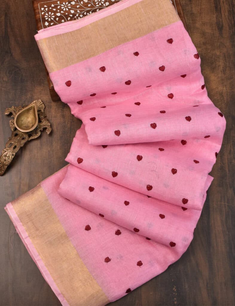 Heart Embroidery Linen Saree in Pink with dainty red hearts from Shobhitam @ ₹7411/-