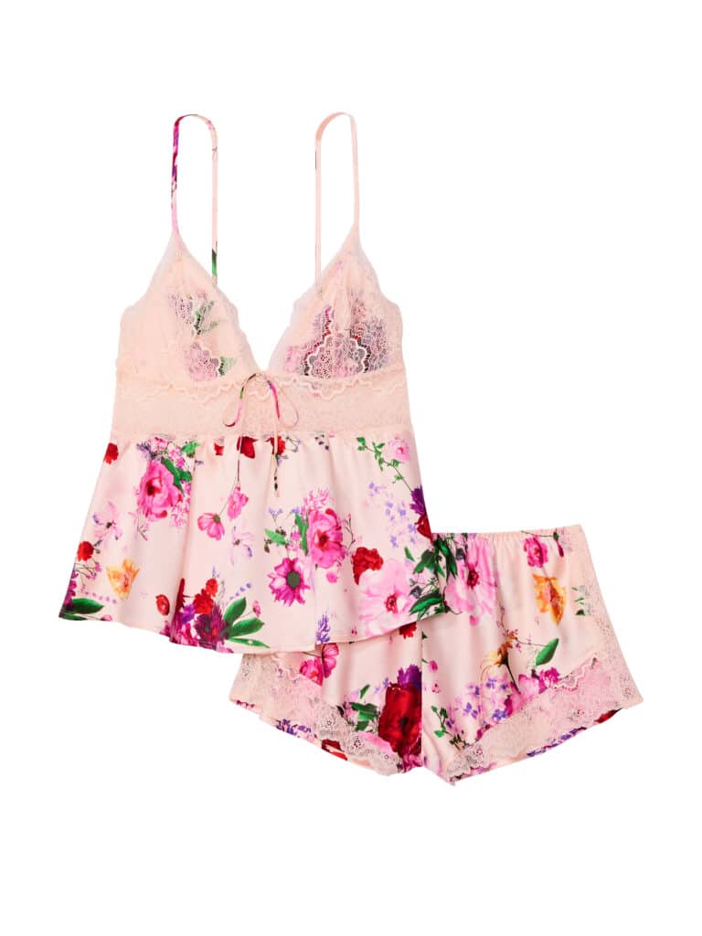 With a trio of covered buttons at the back and lots of luxe lace all around, this cami is sure to be a go-to favorite. Matching pull-on shorts complete the cozy valentine’s day look.
