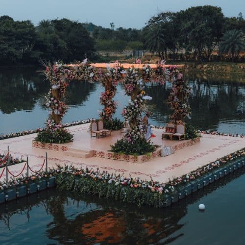 Our venue offers a versatile backdrop for your celebration, transforming it into a destination-worthy experience. Imagine the Glasshouse adorned in our signature Spanish tiles, evoking the charm of a European escape for your pre-wedding celebrations. The lush lawn, set against the picturesque lake, becomes a scene reminiscent of a lavish Jaipur wedding, right in the heart of Bangalore. And for a truly unforgettable experience, our one-of-a-kind floating mandap allows couples to exchange vows on water, reminiscent of the romantic vistas found along Italy’s coast. Best of all, no passport is required—especially for our Indian guests” CEO, Aishwarya Mohan