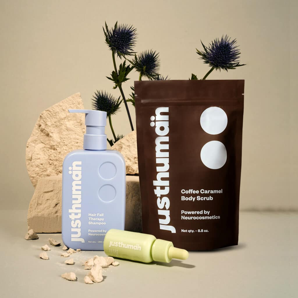 Justhuman Glow & Grow hamper includes the bestseller- Hair Fall Therapy Shampoo, Burgeon Hair Growth Serum & Coffee Caramel Body Scrub. Justhuman Coffee Caramel Body Scrub is a luxurious blend of ground coffee, brown sugar and olive oil that exfoliates, improves blood circulation and reduces water retention. Justhuman Hair Fall Therapy Shampoo features Capilia Longa, a natural ingredient from the stem cell of the Turmeric plant that is proven to activate the scalp’s dermal capilia cells and regenerate hair follicles at their roots. Complete with ginger- and ginseng root extract, the formula packs all the vitamins, minerals, and fatty acids for stronger hair with sustainable textureshine. Justhuman Burgeon Hair Growth Serum consists of Burgeon-up stem extract, a natural ingredient from the lush forests of Japan that stimulates hair growth protein R-spondin 1 and regulates its hair loss counterparts. Complete with Stimucap to reduce inflammation and Kerashaft V to add texture and volume, the formula is the hair- and confidence boost you’ve been waiting for.