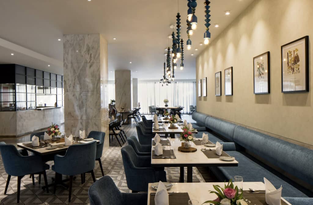 Nestled within this hotel are 206 modern rooms, including eight lavish suites. Each room is meticulously designed to provide a harmonious blend of comfort and modern amenities, catering to the needs of discerning guests. Workstations, free Wi-Fi, universal power adapters, HDMI/USB port connectivity, 49-inch smart LED TVs, turndown services, and in-room coffee/tea facilities ensure a luxurious and convenient stay.