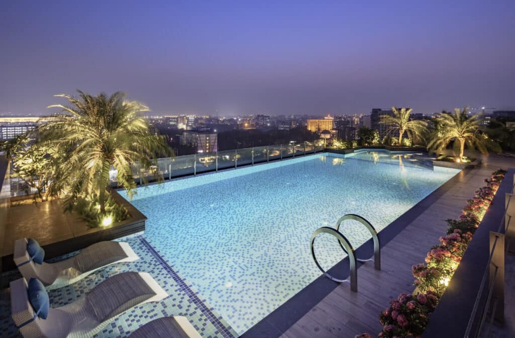 The hotel’s facilities transcend the ordinary, offering a comprehensive range of amenities designed to elevate the guest experience. Guests can indulge in relaxation at the sauna and steam room, rejuvenate at the Rejuve spa, maintain their fitness at the Evolve fitness centre, or take in panoramic views at the rooftop infinity pool. Dining experiences are equally impressive, with Roasters serving delightful desserts, Fiona offering sumptuous full meals, and an alfresco cocktail experience to unwind after a day of festivities.