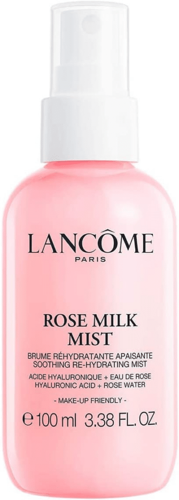 Lancome Rose Milk Mist, 3.38-oz/100mL. As hydrating and comforting as a cream, this nurturing mist can be used as a moisturizing toner and makeup setting spray or on the go for a revitalizing hydration boost. Made with hyaluronic acid and rose water, it transforms from a rich, milky lotion into a light, makeup-friendly cloud that refines and brightens skin with a dewy finish. A more even skin tone and smoother skin that feels softer and more supple are instantly revealed. Skin looks radiant as makeup is refreshed, blends better and feels more comfortable.